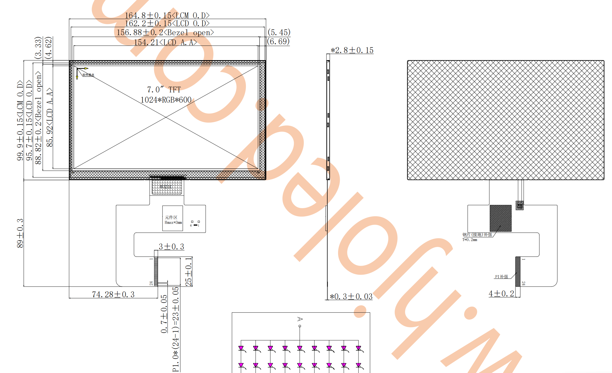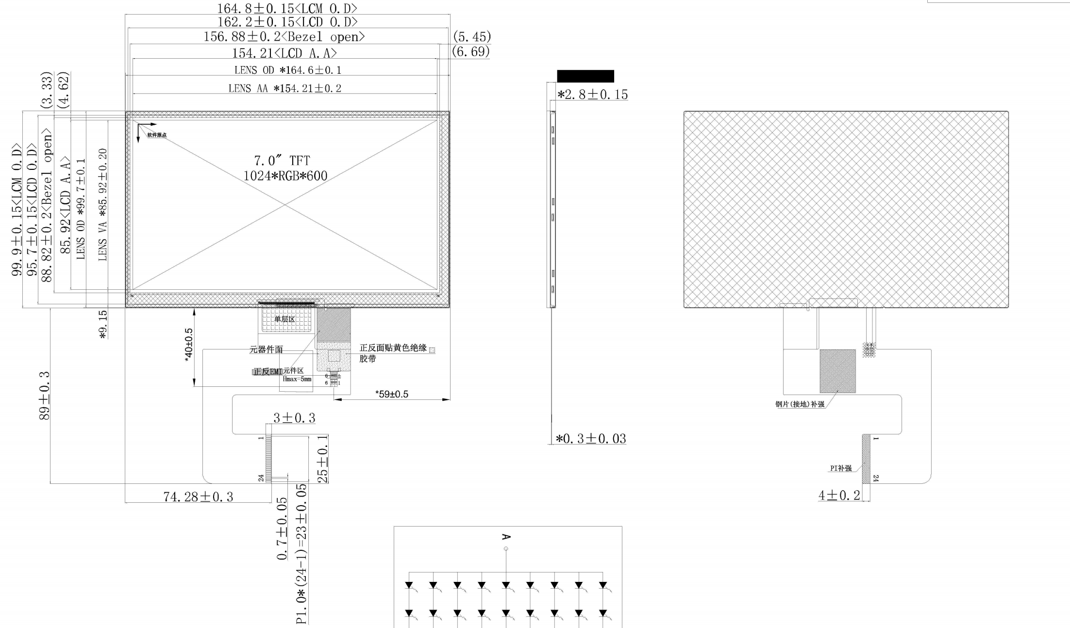 Las pantallas horizontales TFT de 7 pulgadas suelen tener una resolución de 1024*600 y una interfaz MIPI de 4 canales. Las pantallas LCD de 2 canales son raras, y las que integran el cable de pantalla táctil capacitiva con el cable de pantalla LCD son aún más raras, lo que aumenta la carga de trabajo para los ingenieros de hardware. Los ingenieros de Shenzhen Hongjia Technology han producido con éxito pantallas horizontales IPS de 7 pulgadas con una resolución de 1024*600, una interfaz MIPI de 2 canales y una pantalla táctil capacitiva. El conector de 24 PIN integra la pantalla táctil y las señales de visualización, con una única interfaz de cable para facilitar el diseño del cliente.